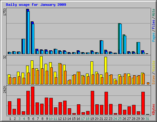 | Day | Hits | Files | Pages | Visits | Sites | KBytes | ||||||