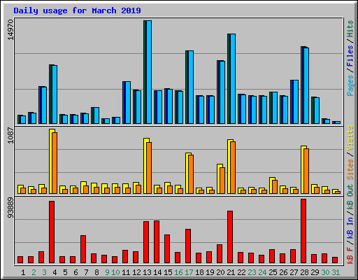 | Day | Hits | Files | Pages | Visits | Sites | kB F | kB In | kB Out | ||||||||